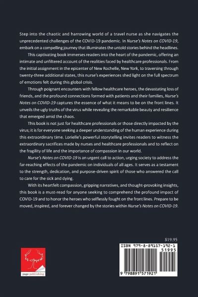 Step into the chaotic and harrowing world of a travel nurse as she navigates the unprecedented challenges of the COVID-19 pandemic. In Nurse's Notes on COVID-19, embark on a compelling journey that illuminates the untold stories behind the headlines. This captivating book immerses readers into the heart of the pandemic, offering an intimate and unfiltered account of the realities faced by healthcare professionals. From the initial assignment in the epicenter of New Rochelle, New York, to traversing through twenty-three additional states, this nurse's experiences shed light on the full spectrum of emotions felt during this global crisis. Through poignant encounters with fellow healthcare heroes, the devastating loss of friends, and the profound connections formed with patients and their families, Nurse's Notes on COVID-19 captures the essence of what it means to be on the front lines. It unveils the ugly truths of the virus while revealing the remarkable beauty and resilience that emerged amid the chaos. This book is not just for healthcare professionals or those directly impacted by the virus; it is for everyone seeking a deeper understanding of the human experience during this extraordinary time. Lorielle's powerful storytelling invites readers to witness the extraordinary sacrifices made by nurses and healthcare professionals and to reflect on the fragility of life and the importance of compassion in our world. Nurse's Notes on COVID-19 is an urgent call to action, urging society to address the far-reaching effects of the pandemic on individuals of all ages. It serves as a testament to the strength, dedication, and purpose-driven spirit of those who answered the call to care for the sick and dying. With its heartfelt compassion, gripping narratives, and thought-provoking insights, this book is a must-read for anyone seeking to comprehend the profound impact of COVID-19 and to honor the heroes who selflessly fought on the front lines. Prepare to be moved, inspired, and forever changed by the stories within Nurse's Notes on COVID-19.