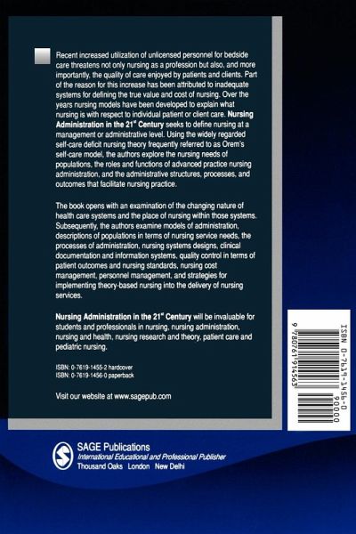 This book seeks to define nursing at a management or administrative level. Using the widely regarded Orem self-care deficit model to provide a nursing focus, the authors explore the nursing needs of populations, the roles and functions of advanced practice nursing administration, and the administrative structures, processes and outcomes that facilitate nursing practice.