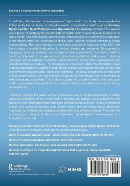 In just the past decade, the emergence of digital health has finally become palpable. Enhanced by the pandemic, social justice events, and planetary health urgency, Realizing Digital Health - Bold Challenges and Opportunities for Nursing explores that evolution with a focus on capturing the current state of digital health. Anchored in an introduction to digital health, new technologies, opportunities, and challenges are described. Consideration of the opportunities and challenges of digital health calls for specific attention to ethical considerations. This book includes a current state synopsis of healthcare in the USA, with the inclusion of specific implications for nursing leaders and executives. Engagement of the people (patients, families, communities) working in partnership to enhance health is described. Information management and the necessary definition and access to data are discussed with a particular explication of the function of information management and operational decision-making. The challenges and learnings related to informatics drawn from the experiences of leaders in large health systems shed insight into the current state of informatics-enabled digital health and healthcare. The global example of the integration of technology, nursing, and health systems expands our knowledge of the current state as well as explores possibilities. This book concludes with a commitment to and description of the current state of teamwork and the integral role/functions within informatics, nursing, and healthcare.