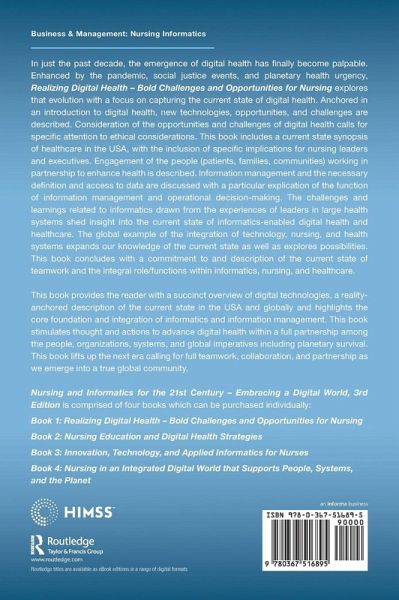 In just the past decade, the emergence of digital health has finally become palpable. Enhanced by the pandemic, social justice events, and planetary health urgency, Realizing Digital Health - Bold Challenges and Opportunities for Nursing explores that evolution with a focus on capturing the current state of digital health. Anchored in an introduction to digital health, new technologies, opportunities, and challenges are described. Consideration of the opportunities and challenges of digital health calls for specific attention to ethical considerations. This book includes a current state synopsis of healthcare in the USA, with the inclusion of specific implications for nursing leaders and executives. Engagement of the people (patients, families, communities) working in partnership to enhance health is described. Information management and the necessary definition and access to data are discussed with a particular explication of the function of information management and operational decision-making. The challenges and learnings related to informatics drawn from the experiences of leaders in large health systems shed insight into the current state of informatics-enabled digital health and healthcare. The global example of the integration of technology, nursing, and health systems expands our knowledge of the current state as well as explores possibilities. This book concludes with a commitment to and description of the current state of teamwork and the integral role/functions within informatics, nursing, and healthcare. This book provides the reader with a succinct overview of digital technologies, a reality-anchored description of the current state in the USA and globally and highlights the core foundation and integration of informatics and information management. This book stimulates thought and actions to advance digital health within a full partnership among the people, organizations, systems, and global imperatives including planetary survival. This book lifts up the next era calling for full teamwork, collaboration, and partnership as we emerge into a true global community. Nursing and Informatics for the 21st Century - Embracing a Digital World, 3rd Edition is comprised of four books which can be purchased individually: Book 1: Realizing Digital Health - Bold Challenges and Opportunities for Nursing Book 2: Nursing Education and Digital Health Strategies Book 3: Innovation, Technology, and Applied Informatics for Nurses Book 4: Nursing in an Integrated Digital World that Supports People, Systems, and the Planet