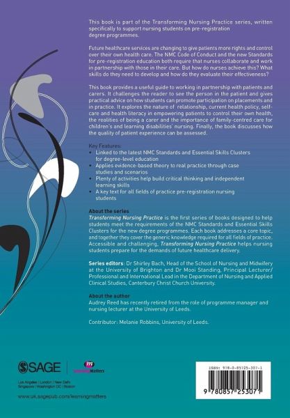 'The title of [this book] truly reflects the content, which achieves the aim of supporting student nurses working across all undergraduate pre-registration nursing and midwifery programmes to understand why this partnership is so essential. The style and format is accessible, directional and supportive of learning in and reflecting on practice by unifying theory with practical examples, activities, case studies, research summaries and scenarios. The mapping of each chapter against the Nursing and Midwifery's Council's Standards for Pre-Registration Nurse Education and Essential Skills Clusters complements learning and is a welcome inclusion. The authors should be commended for creatively illuminating and detailing (with the backing of evidence) why and how these partnerships are the bedrock in delivering individualised person-centred care - and may contribute to restoring the image of nursing.
