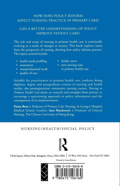 The role and scope of nursing in primary health care is continually evolving as a result of changes in society. This book explores current issues from the perspective of nursing, showing how policy informs practice. The topics covered include: * health needs profiling * assessment * interprofessional work * quality of care * family carers * new nursing roles in primary health care The book is suitable for practioners in primary health care, students doing diploma, degree and postgraduate courses in nursing and health studies, and also post-registration courses. Nursing in Primary Care draws on research and examples from practice to encourage a questioning approach to policy information and the consequences of its implementation.