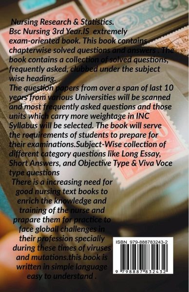 Nursing Research & statistics for BSc Nursing 3rd Year is an extremely exam-oriented book. This book contains chapterwise solved questions and answers . The book contains a collection of solved questions, frequently asked, clubbed under the subject wise heading. The question papers from over a span of last 10 years from various Universities will be scanned and most frequently asked questions and those units which carry more weightage in INC Syllabus will be selected. The book will serve the requirements of students to prepare for their examinations.Subject-Wise collection of different category questions like Long Essay, Short Answers, and Objective Type & Viva Voce type questions Point wise answers Use of Mnemonics facilitating studying. Use of tables and flowcharts. The book contains solved questions papers subject-wise unit wise & topic wise.long essay type answers.short answers and objective type short answers easy and lucid language entire syllabus covered.there is a increasing need for good nursing text books to enrich the knowledge and training of the nurse and prapare them for practice to face globall challenges in their profession specially during these times of viruses and mutations.this book is written in simple language easy to understand .