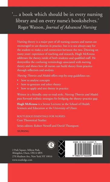 Nursing theory is a major part of all nursing courses and nurses are encouraged to use theories in practice, but it is not always easy for the student to make a real connection between the two. Drawing on many years' experience of teaching and research, Hugh McKenna addresses the theory needs of both students and qualified staff. He demystifies the confusing terminology associated with nursing theory and shows how all nurses can build theory from practice through reflection and analysis. This text offers step-by-step guidelines on: * how to analyse concepts * how to generate and select theory * how to apply and test theory in practice. Written in a friendly, easy to read style, Nursing Theories and Models puts forward realistic strategies for bridging the theory-practice gap.