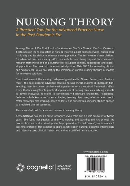 Nursing Theory: A Practical Tool for the Advanced Practice Nurse in the Post Pandemic Era focuses on the re-evaluation of nursing theory in a post-pandemic world, highlighting its fluidity and its ability to enhance nursing practice. The text creates a new platform for advanced practice nursing (APN) students to view theory beyond the confines of research frameworks and as a nursing tool to support clinical, educational, and leadership practices. The book introduces a novel algorithm, MetaPORT, for evaluating clinical and educational issues, facilitating the selection of suitable nursing theories or models for innovative solutions. Structured around the nursing metaparadigm-Health, Nurse, Person, and Environment-the book engages advanced practice nursing (APN) students in metacognition, enabling them to connect professional experiences with theoretical frameworks effectively. It offers insights into practical applications of nursing theories, enabling students to devise innovative solutions to contemporary healthcare challenges. Pedagogical features include key terms for each chapter, learning objectives, reflection exercises to foster metacognizant learning, boxed callouts, and critical thinking case studies applied to simulated clinical scenarios. This is an ideal text for advanced courses in nursing theory.