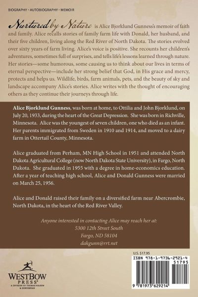 Nurtured by Nature is Alice Bjorklund Gunnesss memoir of faith and family. Alice recalls stories of family farm life with Donald, her husband, and their five children, living along the Red River of North Dakota. The stories evolved over sixty years of farm living. Alices voice is positive. She recounts her childrens adventures, sometimes full of surprises, and tells lifes lessons learned through nature. Her storiessome humorous, some causing us to think about our lives in terms of eternal perspectiveinclude her strong belief that God, in His grace and mercy, protects and helps us. Wildlife, birds, farm animals, pets, and the beauty of sky and landscape accompany Alices stories. Alice writes with the thought of encouraging others as they continue their journeys through life.