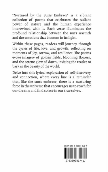 "Nurtured by the Sun's Embrace" is a vibrant collection of poems that celebrates the radiant power of nature and the human experience intertwined with it. Each verse illuminates the profound relationship between the sun's warmth and the emotions that blossom in its light. Within these pages, readers will journey through the cycles of life, love, and growth, reflecting on moments of joy, sorrow, and resilience. The poems evoke imagery of golden fields, blooming flowers, and the serene glow of dawn, inviting the reader to bask in the beauty of the world. Delve into this lyrical exploration of self-discovery and connection, where every line is a reminder that, like the sun's embrace, there is a nurturing force in the universe that encourages us to reach for our dreams and find solace in our true selves.