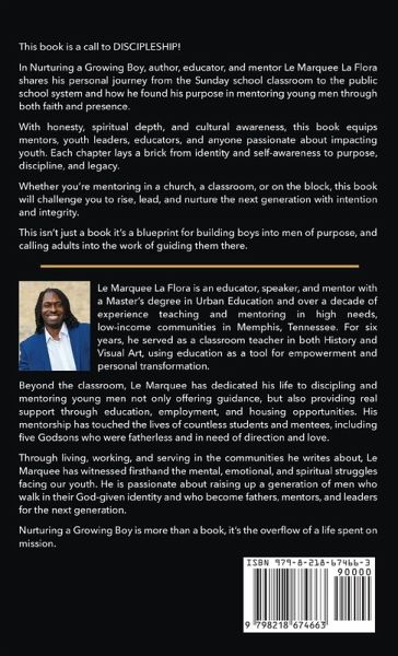This book is a call to DISCIPLESHIP! In Nurturing a Growing Boy, author, educator, and mentor Le Marquee La Flora shares his journey from the Sunday school classroom to the public school system and how he found his purpose in mentoring young men through faith and presence. With honesty, spiritual depth, and cultural awareness, this book equips mentors, youth leaders, educators, and anyone passionate about impacting youth. Each chapter lays a brick from identity and self-awareness to purpose, discipline, and legacy. Whether mentoring in a church, a classroom, or on the block, this book will challenge you to rise, lead, and nurture the next generation with intention and integrity. This isn't just a book, it's a blueprint for building boys into men of purpose, and calling adults into the work of guiding them there.