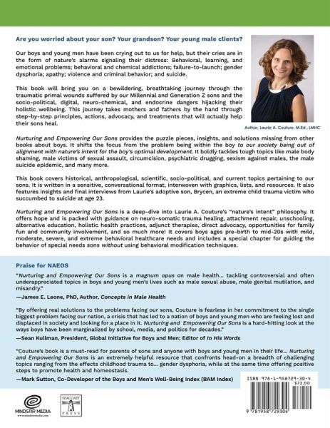 Are you worried about your son? Your grandson? Your young male clients? Our boys and young men have been crying out to us for help, but their cries are in the form of nature's alarms signaling their distress: Behavioral, learning, and emotional problems; behavioral and chemical addictions; failure-to-launch; gender dysphoria; apathy; violence and criminal behavior; and suicide. This book will bring you on a bewildering, breathtaking journey through the traumatic primal wounds suffered by our Millennial and Generation Z sons and the socio-political, digital, neuro-chemical, and endocrine dangers hijacking their holistic wellbeing. This journey takes mothers and fathers by the hand through step-by-step principles, actions, advocacy, and treatments that will actually help their sons heal. Nurturing and Empowering Our Sons provides the puzzle pieces, insights, and solutions missing from other books about boys. It shifts the focus from the problem being within the boy to our society being out of alignment with nature's intent for the boy's optimal development. It boldly tackles tough topics like male body shaming, male victims of sexual assault, circumcision, psychiatric drugging, sexism against males, the male suicide epidemic, and many more. This book covers historical, anthropological, scientific, socio-political, and current topics pertaining to our sons. It is written in a sensitive, conversational format, interwoven with graphics, lists, and resources. It also features insights and final interviews from Laurie's adoptive son, Brycen, an extreme child trauma victim who succumbed to suicide at age 23. Nurturing and Empowering Our Sons is a deep-dive into Laurie A. Couture's "nature's intent" philosophy. It offers hope and is packed with guidance on neuro-somatic trauma healing, attachment repair, unschooling, alternative education, holistic health practices, adjunct therapies, direct advocacy, opportunities for family fun and community involvement, and so much more! It covers boys ages pre-birth to mid-20s with mild, moderate, severe, and extreme behavioral healthcare needs and includes a special chapter for guiding the behavior of special needs sons without using behavioral modification techniques. NAEOS Endorsements Nurturing and Empowering Our Sons is a magnum opus on male health spanning 34 comprehensive and insightful chapters... and not holding back by tackling controversial and often underappreciated topics in boys and young men's lives such as male sexual abuse, male genital mutilation, and misandry. -James E. Leone, PhD, Author, Concepts in Male Health By offering real solutions to the problems facing our sons, Couture is fearless in her commitment to the single biggest problem facing our nation, a crisis that has led to a nation of boys and young men who are feeling lost and displaced in society and looking for a place in it. Nurturing and Empowering Our Sons is a hard-hitting look at the ways boys have been marginalized by school, media, and politics for decades. -Sean Kullman, President, Global Initiative for Boys and Men; Editor of In His Words In this book, Laurie A. Couture explores how boys grow up and are treated in our culture, a much-neglected area. This is a profound book... In the end, no matter who you are, your assumptions are likely to be challenged and you will gain important insights. -Jerry Mintz, Director, Alternative Education Resource Organization (AERO)