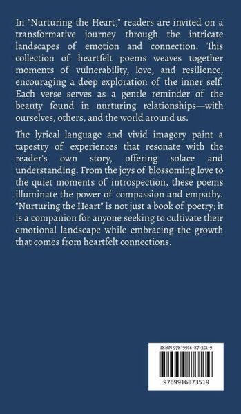 In "Nurturing the Heart," readers are invited on a transformative journey through the intricate landscapes of emotion and connection. This collection of heartfelt poems weaves together moments of vulnerability, love, and resilience, encouraging a deep exploration of the inner self. Each verse serves as a gentle reminder of the beauty found in nurturing relationships-with ourselves, others, and the world around us. The lyrical language and vivid imagery paint a tapestry of experiences that resonate with the reader's own story, offering solace and understanding. From the joys of blossoming love to the quiet moments of introspection, these poems illuminate the power of compassion and empathy. "Nurturing the Heart" is not just a book of poetry; it is a companion for anyone seeking to cultivate their emotional landscape while embracing the growth that comes from heartfelt connections.