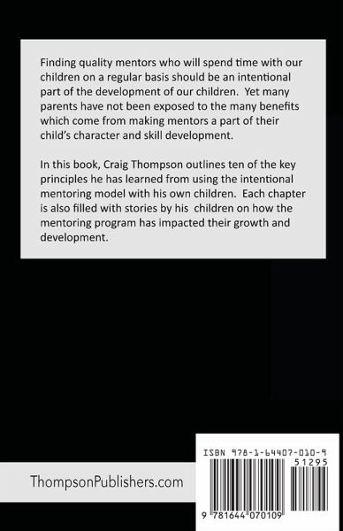 Finding quality mentors who will spend time with our children on a regular basis should be an intentional part of the development of our children. In this book, Craig Thompson outlines ten of the key principles he has learned from using the intentional mentoring model with his own children. Each chapter is also filled with stories by his children on how the mentoring program has impacted their growth and development. This book can help parents understand the role which mentors can play in developing strong, mature children who are better prepared to transition into adulthood.