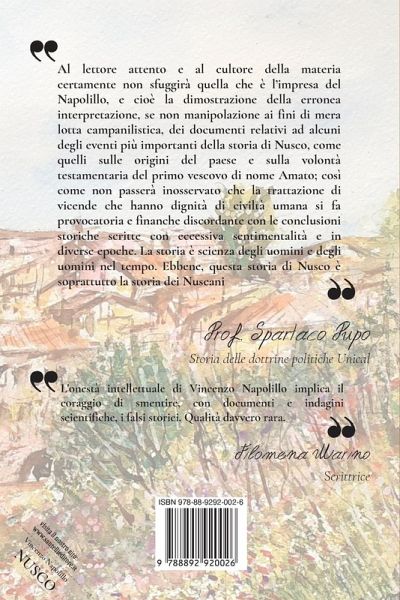 La Storia e l'Arte, i personaggi importanti, feudatari e santi, tutto trova spazio nella trattazione di Vincenzo Napolillo su Nusco. Un'impresa che vede nella dimostrazione dell'erronea interpretazione dei documenti relativi ad alcuni degli eventi più importanti della storia di questa bella cittadina campana, come quelli sulle origini del paese e sulla volontà testamentaria del primo vescovo di nome Amato, trova una delle colonne fondanti della trattazione