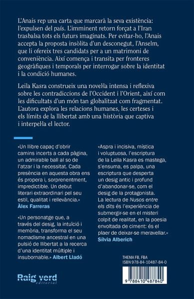 L'Anais acaba de rebre la carta més important de la seva vida: lÆexpulsaran del país i haurà de tornar a lÆIran? Per evitar-ho, valorarà fins i tot la darrera alternativa amb lÆAnselm, un home que acaba de conèixer a la biblioteca, que li ofereix tres candidats per a un matrimoni de conveniència. Aquest serà lÆinici dÆun camí entre diferents èpoques i fronteres on lÆAnais ens captivarà amb la seva determinació per ser lliure.Leila Kasra escriu una emocionant novel·la que travessa la identitat, la llibertat i la soledat. LÆautora manifesta les contradiccions dÆOccident i qüestiona la manera que ens veiem a nosaltres mateixos.------'Un llibre capaç dÆobrir camins incerts a cada pàgina, un admirable ball al so de lÆatzar i la necessitat. Cada presència en aquesta obra ens és propera i, sorprenentment, impredictible. Un debut literari extraordinari pel seu estil, qualitat i rellevància.' +lex Farreras'Un personatge que, a través del desig, la intuïció i mem.ria, transforma el seu nomadisme ancestral en una pulsió de llibertat a la recerca dÆuna identitat múltiple i insubornable.'Albert Lladó'Aspra i incisiva, mística i voluptuosa, lÆescriptura de la Leila Kasra es mastega, sÆensuma, es palpa, una escriptura que desperta un desig antic i profund dÆabandonar-se, com el desig de la protagonista. La lectura de Nusos entre els dits és lÆexperiència de submergir-se en el misteri colpit de realitat, en la poesia envoltada de ciment: és el plaer de deixar-se meravellar.'Sílvia Alberich