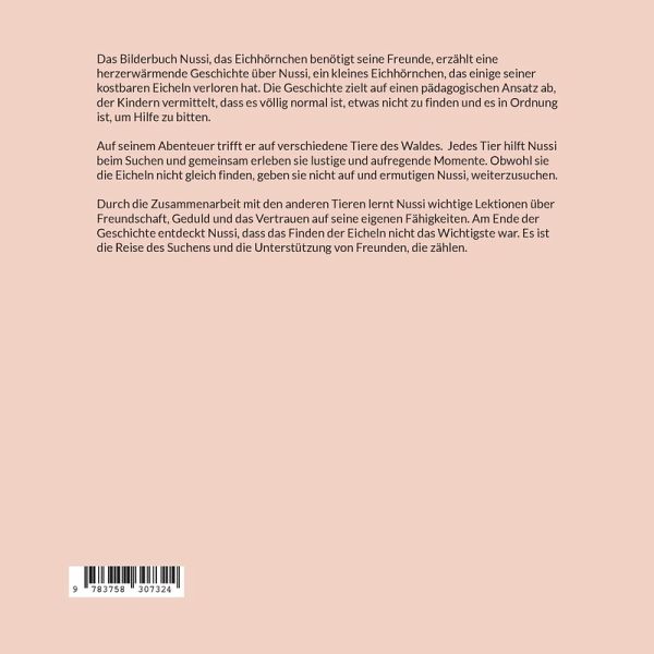 Das Bilderbuch Nussi das Eichhörnchen benötigt seine Freunde, erzählt eine herzerwärmende Geschichte über Nussi, ein kleines Eichhörnchen, das einige seiner kostbaren Eicheln verloren hat. Die Geschichte zielt auf einen pädagogischen Ansatz ab, der Kindern vermittelt, dass es völlig normal ist, etwas nicht zu finden und es in Ordnung ist, um Hilfe zu bitten.Auf seinem Abenteuer trifft er auf verschiedene Tiere des Waldes. Jedes Tier hilft Nussi beim Suchen und gemeinsam erleben sie lustige und aufregende Momente. Obwohl sie die Eicheln nicht gleich finden, geben sie nicht auf und ermutigen Nussi, weiterzusuchen.Durch die Zusammenarbeit mit den anderen Tieren lernt Nussi wichtige Lektionen über Freundschaft, Geduld und das Vertrauen auf seine eigenen Fähigkeiten. Am Ende der Geschichte entdeckt Nussi, dass das Finden der Eicheln nicht das Wichtigste war. Es ist die Reise des Suchens und die Unterstützung von Freunden, die zählen.