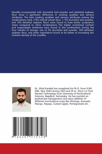 Noodles incorporated with drumstick leaf powder and defatted soybean flour show a significant difference in cooking qualities and sensory attributes. The best cooking qualities and sensory attributes among the combinations tried, (73% refined wheat flour + 5% drumstick leaf powder, and 10% defatted soybean flour) were found to have better acceptance when compared to other combinations. The higher nutritional content and organoleptic attributes were found in this combination during the four months of storage. Use of 5% drumstick leaf powder, 10% defatted soybean flour, and other ingredients found to be better at increasing the nutrient density of the noodles.