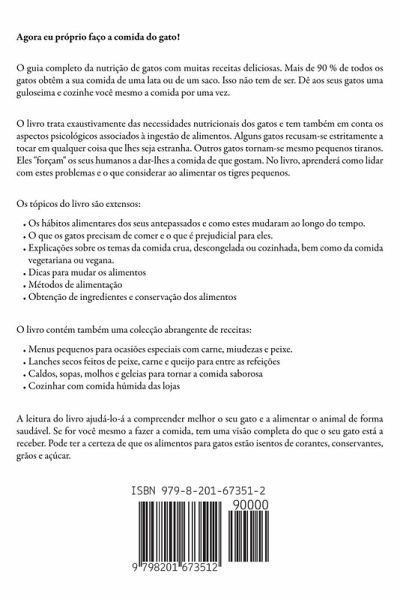 Agora eu próprio faço a comida do gato! O guia completo da nutrição de gatos com muitas receitas deliciosas. Mais de 90 % de todos os gatos obtêm a sua comida de uma lata ou de um saco. Isso não tem de ser. Dê aos seus gatos uma guloseima e cozinhe você mesmo a comida por uma vez. O livro trata exaustivamente das necessidades nutricionais dos gatos e tem também em conta os aspectos psicológicos associados à ingestão de alimentos. Alguns gatos recusam-se estritamente a tocar em qualquer coisa que lhes seja estranha. Outros gatos tornam-se mesmo pequenos tiranos. Eles "forçam" os seus humanos a dar-lhes a comida de que gostam. No livro, aprenderá como lidar com estes problemas e o que considerar ao alimentar os tigres pequenos. Os tópicos do livro são extensos:Os hábitos alimentares dos seus antepassados e como estes mudaram ao longo do tempo. O que os gatos precisam de comer e o que é prejudicial para eles. Explicações sobre os temas da comida crua, descongelada ou cozinhada, bem como da comida vegetariana ou vegana. Dicas para mudar os alimentos Métodos de alimentação Obtenção de ingredientes e conservação dos alimentos O livro contém também uma colecção abrangente de receitas:Menus pequenos para ocasiões especiais com carne, miudezas e peixe. Lanches secos feitos de peixe, carne e queijo para entre as refeições Caldos, sopas, molhos e geleias para tornar a comida saborosa Cozinhar com comida húmida das lojas A leitura do livro ajudá-lo-á a compreender melhor o seu gato e a alimentar o animal de forma saudável. Se for você mesmo a fazer a comida, tem uma visão completa do que o seu gato está a receber. Pode ter a certeza de que os alimentos para gatos estão isentos de corantes, conservantes, grãos e açúcar. Por uma boa razão, o livro não se limita simplesmente a receitas, mas proporciona um conhecimento abrangente da nutrição dos gatos. Divirta-se e aprecie a sua refeição!