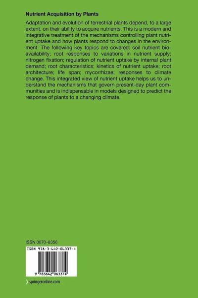 Adaptation and evolution of terrestrial plants depend, to a large extent, on their ability to acquire nutrients. This is a modern and integrative treatment of the mechanisms controlling plant nutrient uptake and how plants respond to changes in the environment. The following key topics are covered: soil nutrient bioavailability; root responses to variations in nutrient supply; nitrogen fixation; regulation of nutrient uptake by internal plant demand; root characteristics; kinetics of nutrient uptake; root architecture; life span; mycorrhizae; responses to climate change. This integrated view helps us to understand the mechanisms that govern present-day plant communities and is indispensable in models designed to predict the response of plants to a changing climate.