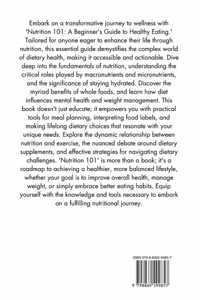 "Nutrition 101: A Beginner's Guide to Healthy Eating" is an essential read for anyone looking to embark on a journey towards a healthier lifestyle through informed dietary choices. This comprehensive guide covers all facets of nutrition, from the basics of macronutrients and micronutrients to the importance of hydration, the benefits of whole foods, and the role of diet in mental health and weight management. With chapters dedicated to meal planning, understanding food labels, and the impact of nutrition across the lifespan, this book offers practical advice for adopting and maintaining a balanced diet tailored to individual needs. It also explores the synergy between nutrition and physical activity, the pros and cons of dietary supplements, and provides strategies for overcoming common dietary challenges. Whether you're looking to improve your health, manage your weight, or simply eat better, this guide provides the knowledge and tools you need to achieve your nutritional goals.