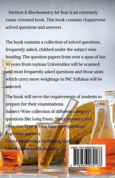 NUTRITION AND BIOCHEMISTRY FOR BSc Nursing 1st Year is an extremely exam-oriented book. This book contains chapterwise solved questions and answers . The book contains a collection of solved questions, frequently asked, clubbed under the subject wise heading. The question papers from over a span of last 10 years from various Universities will be scanned and most frequently asked questions and those units which carry more weightage in INC Syllabus will be selected. The book will serve the requirements of students to prepare for their examinations.Subject-Wise collection of different category questions like Long Essay, Short Answers, and Objective Type & Viva Voce type questions Point wise answers Use of Mnemonics facilitating studying. Use of tables and flowcharts. The book contains solved questions papers subject-wise unit wise & topic wise.long essay type answers.short answers and objective type short answers easy and lucid language entire syllabus covered.there is a increasing need for good nursing text books to enrich the knowledge and training of the nurse and prapare them for practice to face globall challenges in their profession specially during these times of viruses and mutations.this book is written in simple language easy to understand .