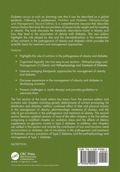 Diabetes occurs at such an alarming rate that it can be described as a global epidemic. Following its predecessor, Nutrition and Diabetes: Pathophysiology and Management, Second Edition, is a comprehensive resource that describes various factors that drive the accumulation of excess body weight and fat resulting in obesity. The book discusses the metabolic aberrations found in obesity and how they lead to the association of obesity with diabetes. This new edition highlights the role played by diet and the interrelationships in the metabolism of key nutrients in the pathogenesis of obesity and diabetes which provides the scientific basis for treatment and management approaches. Features Highlights the role of nutrition in the pathogenesis of obesity and diabetes Organized logically into two easy-to-use sections - Pathophysiology and Management of Obesity and Pathophysiology and Treatment of Diabetes Features emerging therapeutic approaches for management of obesity and diabetes Discusses experience in the management of obesity and diabetes in developing countries Presents challenges in insulin therapy and provides guidelines to overcome them The first section of the book retains key topics from the previous edition and contains new chapters including genetic determinants of nutrient processing; fat distribution and diabetes mellitus; combined effect of diet and physical activity in the management of obesity; pharmacologic treatment of obesity; and the role of gut microbiota in the pathogenesis and treatment of obesity. The second section features updated versions of most of the other chapters in the first edition comprising a modified chapter on oxidative stress and the effects of dietary supplements on glycemic control in Type 2 diabetes. In addition, new chapters are added in this section and include the contribution of iron and transition metal micronutrients to diabetes; role of microbiota in the pathogenesis and treatment of diabetes; primary prevention of Type 2 diabetes; and the pathophysiology and management of Type 1 diabetes.