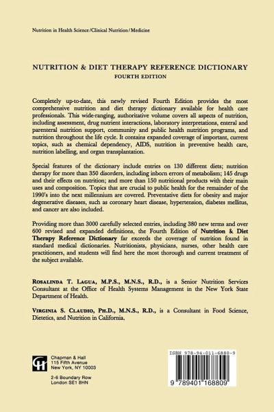 A very easy-to-use desk reference...contains an enormous amount of information on nutrition that is not found in standard medical dictionaries. - Doody Health Sciences Supplement, October 1996; A very easy-to-use desk reference...contains an enormous amount of information on nutrition that is not found in standard medical dictionaries. - Doody Health Sciences Supplement, October 1996; Both the professional and lay person interested in nutrition and dietetic issues will find the new fourth edition of the Nutrition and Diet Therapy Reference Dictionary to be a welcomed addition to their libraries. - Jnl. of Nutrition for the Elderly; Overall the new Nutrition and Diet Therapy Reference dictionary provides a wealth of important knowledge, carefully laid out in a coherent and well thought-out manner. Its thoroughness and superior quality establishes this book as an important reference for all libraries. - Jnl. of Nutrition for the Elderly