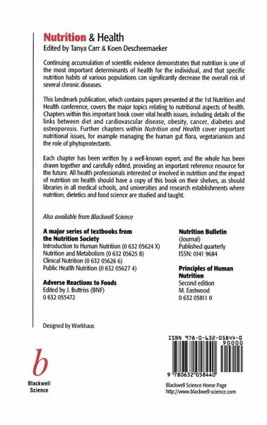 Continuing accumulation of scientific evidence demonstrates that nutrition is one of the most important determinants of health for the individual, and that specific nutrition habits of various populations can significantly decrease the overall risk of several chronic diseases. This landmark publication, which contains papers presented at the 1st Nutrition and Health conference, covers the major topics relating to nutritional aspects of health. Chapters within this important book cover vital health issues, including details of the links between diet and cardiovascular disease, obesity, cancer, diabetes and osteoporosis. Further chapters within Nutrition and Health cover important nutritional issues, for example managing the human gut flora, vegetarianism and the role of phytoprotectants. Each chapter has been written by a well-known expert, and the whole has been drawn together and carefully edited, providing an important reference resource for the future. All health professionals interested or involved in nutrition and the impact of nutrition on health should have a copy of this book on their shelves, as should libraries in all medical schools, and universities and research establishments where nutrition, dietetics and food science are studied and taught.
