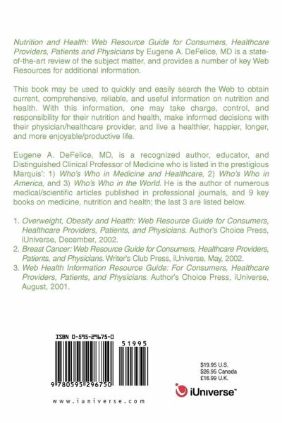 Nutrition and Health: Web Resource Guide for Consumers, Healthcare Providers, Patients and Physicians by Eugene A. DeFelice, MD is a state-of-the-art review of the subject matter, and provides a number of key Web Resources for additional information. This book may be used to quickly and easily search the Web to obtain current, comprehensive, reliable, and useful information on nutrition and health. With this information, one may take charge, control, and responsibility for their nutrition and health, make informed decisions with their physician/healthcare provider, and live a healthier, happier, longer, and more enjoyable/productive life. Eugene A. DeFelice, MD, is a recognized author, educator, and Distinguished Clinical Professor of Medicine who is listed in the prestigious Marquis': 1) Who's Who in Medicine and Healthcare, 2) Who's Who in America, and 3) Who's Who in the World. He is the author of numerous medical/scientific articles published in professional journals, and 9 key books on medicine, nutrition, and health; the last 3 are listed below. 1. Overweight, Obesity and Health: Web Resource Guide for Consumers, Healthcare Providers, Patients, and Physicians. Author's Choice Press, iUniverse, December, 2001. 2. Breast Cancer: Web Resource Guide for Consumers, Healthcare Providers, Patients, and Physicians. Writer's Club Press, iUniverse, May, 2002 3. Web Health Information Resource Guide: For Consumers, Healthcare Providers, Patients, and Physicians. Author's Choice Press, iUniverse, August, 2002.