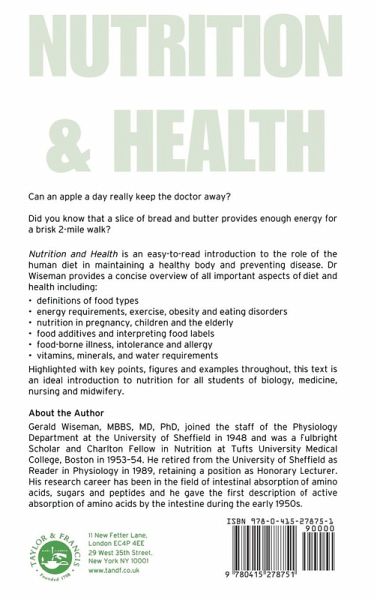 Nutrition and Health is an easy-to-read introduction to the role of the human diet in maintaining a healthy body and preventing disease. It provides a concise overview of the important aspects of diet and health including definitions of food types, food additives and interpreting food labels, vitamins, minerals, and water requirements. The text also explores nutrition in pregnancy, children, and the elderly as well as energy requirements, exercise, obesity and eating disorders. Highlighted with key points, figures and examples throughout, this reference is an ideal introduction for professionals and students in biology, medicine, and nursing.