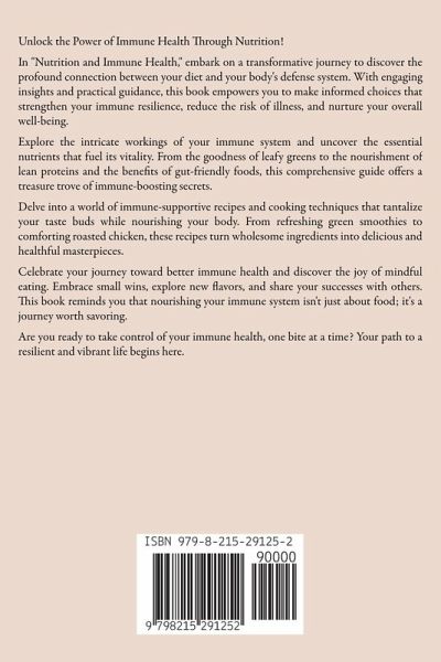 Unlock the Power of Immune Health Through Nutrition! In "Nutrition and Immune Health," embark on a transformative journey to discover the profound connection between your diet and your body's defense system. With engaging insights and practical guidance, this book empowers you to make informed choices that strengthen your immune resilience, reduce the risk of illness, and nurture your overall well-being. Explore the intricate workings of your immune system and uncover the essential nutrients that fuel its vitality. From the goodness of leafy greens to the nourishment of lean proteins and the benefits of gut-friendly foods, this comprehensive guide offers a treasure trove of immune-boosting secrets. Delve into a world of immune-supportive recipes and cooking techniques that tantalize your taste buds while nourishing your body. From refreshing green smoothies to comforting roasted chicken, these recipes turn wholesome ingredients into delicious and healthful masterpieces. Celebrate your journey toward better immune health and discover the joy of mindful eating. Embrace small wins, explore new flavors, and share your successes with others. This book reminds you that nourishing your immune system isn't just about food; it's a journey worth savoring. Are you ready to take control of your immune health, one bite at a time? Your path to a resilient and vibrant life begins here.
