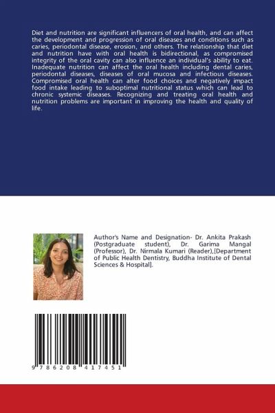 Diet and nutrition are significant influencers of oral health, and can affect the development and progression of oral diseases and conditions such as caries, periodontal disease, erosion, and others. The relationship that diet and nutrition have with oral health is bidirectional, as compromised integrity of the oral cavity can also influence an individual's ability to eat. Inadequate nutrition can affect the oral health including dental caries, periodontal diseases, diseases of oral mucosa and infectious diseases. Compromised oral health can alter food choices and negatively impact food intake leading to suboptimal nutritional status which can lead to chronic systemic diseases. Recognizing and treating oral health and nutrition problems are important in improving the health and quality of life.