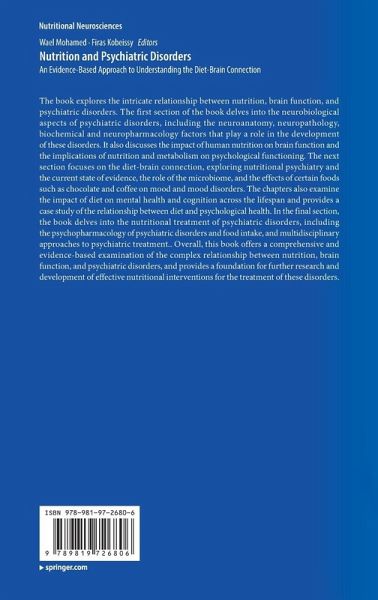Chapter 1_Neuroanatomy and Neuropathology of Psychiatric Disorders.- Chapter 2_Biochemical and Neuropharmacology of Psychiatric disorders.- Chapter 3_Human Nutritional Neuroscience: Fundamental Issues.- Chapter 4_ Central Nervous System Regulation of Eating and brain functions.- Chapter 5_Implicated pathways in diet and mental illness.- Chapter 6_Nutrition, the immune and inflammatory systems, and mental illness: what is the interplays.- Chapter 7_the impact of Gut microbiota on mental health.- Chapter 8_Towards better science-based advice on nutrition.- Chapter 9_Chocolate: food for mood.- Chapter 10_Measuring mood in nutritional research.- Chapter 11_The connection between what we eat and our brains throughout the whole life journey.- Chapter 12_Diet and Psychosis.- Chapter 13_Effects of Coffee and Caffeine on Mood and Mood Disorders.- Chapter 14_Deficiencies in vitamins and disease-specific diets impacting on mental health.- Chapter 15_Ketogenic Diet, Mediterranean Diet and Mental health.- Chapter 16_Myths about Diet and Mental Health.- Chapter 17_Psychopharmacology of psychiatric disorders and Food Intake.- Chapter 18_Supplements Effective in the Treatment of Mental Health Conditions.- Chapter 19_Diet and Sleep disorders.- Chapter 20_Nutritional interventions Vs pharmacological interventions.- Chapter 21_The Western Diet Puzzle: Connecting Metabolic Dysfunction to Cognitive and Neurological Consequences.- Chapter 22_Nutritional Psychiatry: the present state of the evidence.