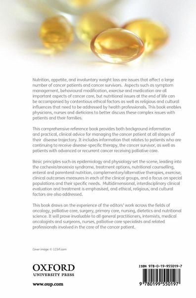 Nutrition, appetite, and involuntary weight loss are issues that affect a large number of cancer patients and cancer survivors. Aspects such as symptom management, behavioural modification, exercise and medication are all important aspects of cancer care, but nutritional issues at the end of life can be accompanied by contentious ethical factors as well as religious and cultural influences that need to be addressed by health professionals. This book enables physicians, nurses and also dieticians to better discuss these complex issues with patients and their families. This comprehensive reference book provides both background information and practical, clinical advice for managing the cancer patient at all stages of their disease trajectory. It includes information that relates to patients who are continuing to receive disease-specific therapy, the cancer survivor, as well as patients with advanced or recurrent cancer receiving palliative care. Basic principles such as epidemiology and physiology set the scene, leading into the cachexia/anorexia syndrome, treatment options, nutritional counselling, enteral and parenteral nutrition, complementary/alternative therapies, exercise, clinical outcomes measures in each of the clinical groups, and focus on special populations and their specific needs. Multidimensional, interdisciplinary clinical evaluation and treatment is emphasised, and ethical, religious, and cultural factors are also addressed. Multidisciplinary in nature, this book draws on the experience of the editors' work across the fields of oncology, palliative care, surgery, primary care, nursing, dietetics and nutritional science. It will prove invaluable to all general practitioners, internists, medical oncologists and surgeons, nurses, palliative care specialists and related professionals involved in the care of the cancer patient.