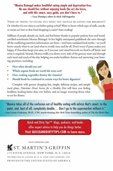 Tired of trying to figure out what you should be eating for breakfast, or whether it's ever OK to eat before going to bed? Want to know which type of milk, or cereals, or meats are best so that food shopping is easier? Millions of people already eat, look, and feel better thanks to popular podcast host and board-certified nutritionist Monica Reinagel. In her highly-anticipated guidebook she sorts through all the conflicting nutrition information out there and busts outdated food myths, so you'll know exactly what to eat (and what to avoid) once and for all. Don't worry if pasta makes you happy, if chocolate keeps you sane, or if you just can't stand broccoli; no food is off limits and none is required. Instead, Monica walks you through every aisle of the grocery store and through each meal and snack of the day, helping you make healthier choices and answering your burning questions, including: - How often should you eat? - Which organic foods are worth the extra cost? - Does cooking vegetables destroy the vitamins? - Should foods be combined in certain ways for better digestion? Complete with grocery shopping lists, simple, delicious recipes, and sample meal plans, Nutrition Diva's Secrets for a Healthy Diet will have you feeling healthier, looking better than ever before, and no longer worrying about what to eat for dinner.