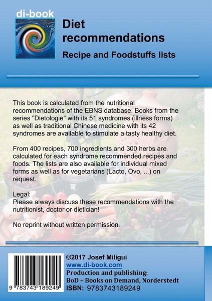 di-book - nutritional counseling after syndromes - Diet recommendations, recipes and food supplements for supporting the school medicine therapy. The recipes help you to cook tasty dishes. All recipes with cooking instructions, calorie indications and description of the effect. The foods are shown in categories recommended, yes, little and no and help you to orientate if your own recipes should be cooked.