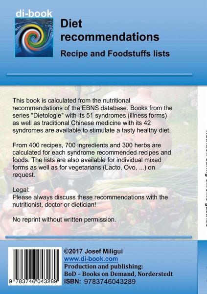 di-book - nutritional counseling after syndromes - Diet recommendations, recipes and food supplements for supporting the school medicine therapy. The recipes help you to cook tasty dishes. All recipes with cooking instructions, calorie indications and description of the effect. The foods are shown in categories recommended, yes, little and no and help you to orientate if your own recipes should be cooked.