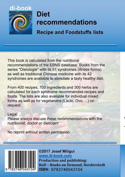 di-book - nutritional counseling after syndromes - Diet recommendations, recipes and food supplements for supporting the school medicine therapy. The recipes help you to cook tasty dishes. All recipes with cooking instructions, calorie indications and description of the effect. The foods are shown in categories recommended, yes, little and no and help you to orientate if your own recipes should be cooked.