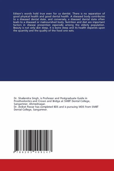 Edison's words hold true even for us dentist. There is no separation of good physical health and good dental health. A diseased body contributes to a diseased dental state, and conversely, a diseased dental state often leads to a diseased or malnourished body. Nutrition and diet are important factors in disease prevention especially among the elderly population. Beauty is not only skin deep, it is bone deep and its health depends upon the quantity and the quality of the food one eats.