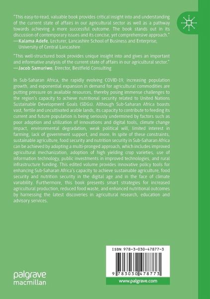 In Sub-Saharan Africa, the rapidly evolving COVID-19, increasing population growth, and exponential expansion in demand for agricultural commodities are putting pressure on available resources, thereby posing immense challenges to the region's capacity to achieve nutritional security related to United Nations Sustainable Development Goals (SDGs). Although Sub-Saharan Africa boasts vast, fertile and uncultivated arable lands, its capacity to contribute to feeding its current and future population is being seriously undermined by factors such as poor adoption and utilization of innovations and digital tools, climate change impact, environmental degradation, weak political will, limited interest in farming, lack of government support, and more. In spite of these constraints, sustainable agriculture, food security and nutrition security in Sub-Saharan Africa can be achieved by adopting a multi-pronged approach, which includes improved agricultural mechanization, adoption of high yielding crop varieties, use of information technology, public investments in improved technologies, and rural infrastructure funding. This edited volume provides innovative policy tools for enhancing Sub-Saharan Africa's capacity to achieve sustainable agriculture, food security and nutrition security in the digital age and in the face of climate variability. Furthermore, this book presents smart strategies for increased agricultural production, reduced food waste, and enhanced nutritional outcomes by harnessing the latest discoveries in agricultural research, education and advisory services.