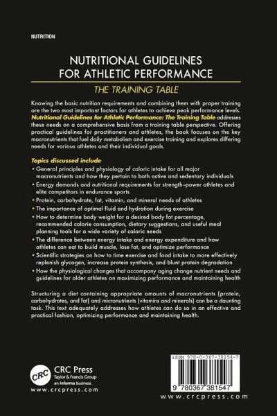 Basic nutrition requirements and proper training are the two most important factors for athletes to achieve peak performance levels. This volume addresses these needs on a comprehensive basis from a training table perspective. Offering practical guidelines for practitioners and athletes, the book focuses on the key macronutrients that fuel daily metabolism and exercise training, and explores differing needs for various athletes and their individual goals. It discusses how to determine body weight for a desired body fat percentage, recommended calorie consumption, dietary suggestions, and useful meal planning tools for a wide variety of caloric needs.