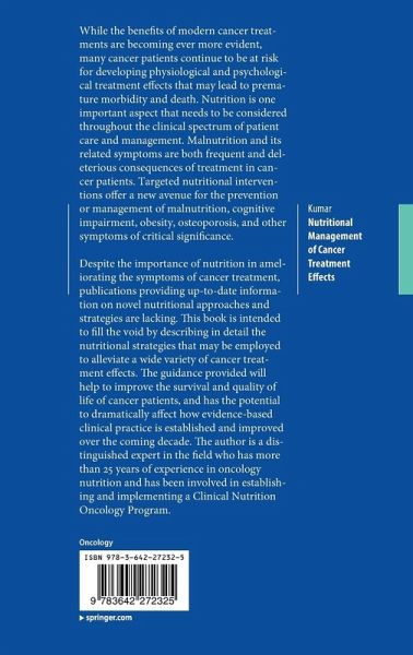 Malnutrition and its related symptoms are both frequent and deleterious effects of cancer treatment. Despite the importance of targeted nutritional interventions in ameliorating these effects, however, publications providing up-to-date information on novel nutritional approaches and strategies are lacking. This book is intended to fill the void by describing and evaluating in detail the nutritional strategies that may be employed to alleviate a wide variety of cancer treatment effects. The guidance provided will help to improve the survival and quality of life of cancer patients, and has the potential to dramatically affect how evidence-based clinical practice is established and improved over the coming decade. The author is a distinguished expert in the field who has more than 25 years of experience in oncology nutrition and has been involved in establishing and implementing a Clinical Nutrition Oncology Program.