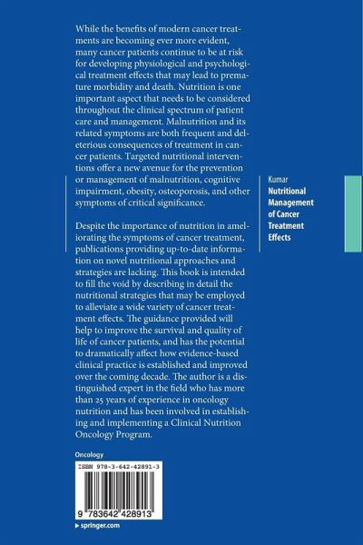 Malnutrition and its related symptoms are both frequent and deleterious effects of cancer treatment. Despite the importance of targeted nutritional interventions in ameliorating these effects, however, publications providing up-to-date information on novel nutritional approaches and strategies are lacking. This book is intended to fill the void by describing and evaluating in detail the nutritional strategies that may be employed to alleviate a wide variety of cancer treatment effects. The guidance provided will help to improve the survival and quality of life of cancer patients, and has the potential to dramatically affect how evidence-based clinical practice is established and improved over the coming decade. The author is a distinguished expert in the field who has more than 25 years of experience in oncology nutrition and has been involved in establishing and implementing a Clinical Nutrition Oncology Program.