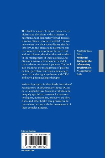 "This book covers the nutritional component of managing inflammatory bowel disease (IBD) ... . The audience is healthcare providers involved in the management of these patients. ... I have already used this book a number of times in my clinical practice and continue to learn a great deal from it. In addition, I have encountered many questions from patients about what to eat, and this book serves as an excellent guide." (Sunny Lo, Doody's Book Reviews, July, 2016)