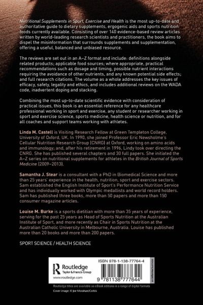 Linda M. Castell is Visiting Research Fellow at Green Templeton College, University of Oxford, UK. In 1990, she joined Professor Eric Newsholme's Cellular Nutrition Research Group (CNRG) at Oxford, working on amino acids and immunology; and, after his retirement in 1996, she took over directing the CNRG. She has published several chapters and 30 papers. She initiated the A-Z series on nutritional supplements for athletes in the British Journal of Sports Medicine (2009-2013) Samantha J. Stear is a consultant with a PhD in Biomedical Science and more than 25 years' experience in the health, nutrition, sport and exercise sectors. Sam established the English Institute of Sport's Performance Nutrition Service and has individually worked with Olympic medallists and world record holders. Sam has published three books, more than 50 papers and more than 150 consumer magazine articles Louise M. Burke is a sports dietitian with more than 35 years of experience, serving for the past 25 years as Head of Sports Nutrition at the Australian Institute of Sport, and more recently as Chair in Sports Nutrition at the Australian Catholic University in Melbourne, Australia. Louise has published more than 20 books and more than 200 papers