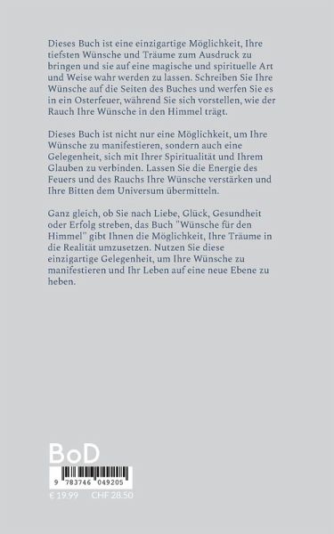 Dieses Buch ist eine einzigartige Möglichkeit, Ihre tiefsten Wünsche und Träume zum Ausdruck zu bringen und sie auf eine magische und spirituelle Art und Weise wahr werden zu lassen. Schreiben Sie Ihre Wünsche auf die Seiten des Buches und werfen Sie es in ein Osterfeuer, während Sie sich vorstellen, wie der Rauch Ihre Wünsche in den Himmel trägt.Dieses Buch ist nicht nur eine Möglichkeit, um Ihre Wünsche zu manifestieren, sondern auch eine Gelegenheit, sich mit Ihrer Spiritualität und Ihrem Glauben zu verbinden. Lassen Sie die Energie des Feuers und des Rauchs Ihre Wünsche verstärken und Ihre Bitten dem Universum übermitteln.Ganz gleich, ob Sie nach Liebe, Glück, Gesundheit oder Erfolg streben, das Buch "Wünsche für den Himmel" gibt Ihnen die Möglichkeit, Ihre Träume in die Realität umzusetzen. Nutzen Sie diese einzigartige Gelegenheit, um Ihre Wünsche zu manifestieren und Ihr Leben auf eine neue Ebene zu heben.