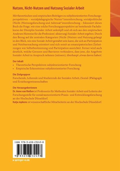 Mit theoretischen und empirischen Beiträgen zu subjektorientierten Forschungsperspektiven - sozialpädagogische Nutzer_innenforschung, sozialpolitische (Nicht-)Nutzungsforschung und Adressat_innenforschung - fokussiert dieses Buch die Frage, wie eine solche Forschungsperspektive an bestehende Fachdiskurse der Disziplin Sozialer Arbeit anknüpft und ob sich aus den empirischen Analysen Hinweise für die Profession(-alisierung) Sozialer Arbeit ergeben. Durch den Bezug auf die zentralen Kategorien (Nicht-)Nutzen und Nutzung gelangt in den Blick, wie eine Soziale Arbeit gestaltet sein kann, die sich an Partizipation und Nutzbarmachung orientiert und sich somit an emanzipatorischen Zielsetzungen wie Selbstbestimmung und Partizipation ausrichtet. Ferner wird auch deutlich, welche Grenzen und Barrieren verhindern, dass jene, die Angebote Sozialer Arbeit in Anspruch nehmen (müssen), überhaupt 'etwas davon haben'.