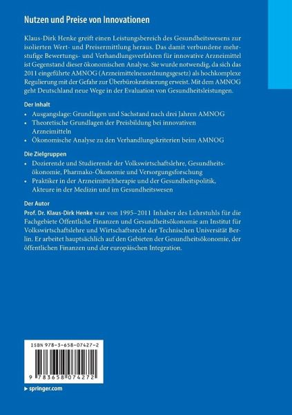 Klaus-Dirk Henke greift einen Leistungsbereich des Gesundheitswesens zur isolierten Wert- und Preisermittlung heraus. Das damit verbundene mehrstufige Bewertungs- und Verhandlungsverfahren für innovative Arzneimittel ist Gegenstand dieser ökonomischen Analyse. Sie wurde notwendig, da sich das 2011 eingeführte AMNOG (Arzneimittelneuordnungsgesetz) als hochkomplexe Regulierung mit der Gefahr zur Überbürokratisierung erweist. Mit dem AMNOG geht Deutschland neue Wege in der Evaluation von Gesundheitsleistungen.