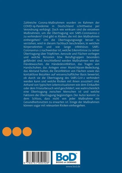 Zahlreiche Corona-Maßnahmen wurden im Rahmen der COVID-19-Pandemie in Deutschland schrittweise per Verordnung verhängt. Doch wie wirksam sind die einzelnen Maßnahmen, um die Übertragung von SARS-Coronavirus-2 zu verhindern? Und gibt es Risiken, die mit den Maßnahmen einhergehen? Um die Übertragungswege besser zu verstehen, wird in diesem Fachbuch beschrieben, in welchen Körpersekreten und wie lange infektiöses SARS-Coronavirus-2 nachweisbar ist, welche Erkenntnisse zu seiner Übertragung über Tröpfchen, Aerosole und Flächen vorliegen und welche Personen bzw. Berufsgruppen besonders gefährdet sind. Anschließend werden Maßnahmen wie das Händewaschen, die Händedesinfektion, das Tragen von Handschuhen, das Anlegen einer Mund-Nasen-Bedeckung, das Abstand halten, die Desinfektion von Flächen sowie das kontaktlose Bezahlen auf wissenschaftlicher Basis bewertet, ob durch sie die Übertragung des SARS-CoV-2 verhindert werden kann und welche Risiken mit ihnen assoziiert sind. Anhand von typischen Lebenssituationen wie dem Einkaufen oder dem Friseurbesuch wird geschildert, wie wahrscheinlich eine Übertragung zwischen Menschen ist und welche Faktoren die Übertragung begünstigen. Der Autor kommt zu dem Schluss, dass nicht von jeder Maßnahme ein Gesundheitsnutzen zu erwarten ist. Einige der Maßnahmen können sogar mit relevanten Risiken einhergehen.