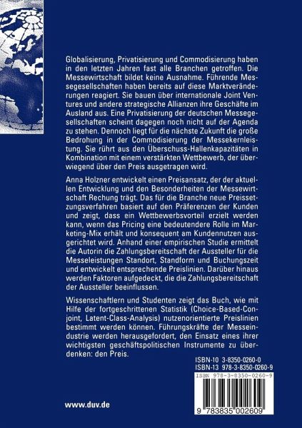 Anna Holzner entwickelt einen Preisansatz, der der aktuellen Entwicklung und den Besonderheiten der Messewirtschaft Rechung trägt. Das für die Branche neue Preissetzungsverfahren basiert auf den Präferenzen der Kunden und zeigt, dass ein Wettbewerbsvorteil erzielt werden kann, wenn das Pricing eine bedeutendere Rolle im Marketing-Mix erhält und konsequent am Kundennutzen ausgerichtet wird. Anhand einer empirischen Studie ermittelt die Autorin die Zahlungsbereitschaft der Aussteller für die Messeleistungen Standort, Standform und Buchungszeit und entwickelt entsprechende Preislinien. Darüber hinaus werden Faktoren aufgedeckt, die die Zahlungsbereitschaft der Aussteller beeinflussen.