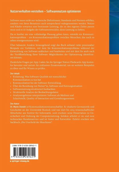 Software muss nicht nur technische Definitionen, Standards und Normen erfüllen, sondern von ihren Benutzern auch entsprechend wahrgenommen werden. Nutzer und Käufer erwarten eine bestimmte Leistung, die zu den eigenen Zielen passen muss und es ist Aufgabe der Softwareentwickler, diese Leistung zu liefern.Da es hierbei nie eine vollständige Passung geben kann, entsteht ein Kommunikationsproblem - ein Kommunikationsproblem zwischen Menschen, das noch zu selten ernstgenommen wird. Über bekannte Ansätze hinausgehend zeigt das Buch anhand vieler praxisnaher Beispiele ein Verfahren, mit dem Sie Kommunikationsprobleme während der Entwicklung von Software aufdecken und bearbeiten und mit dem Sie auch nach der Veröffentlichung Ihrer Software Möglichkeiten der Optimierung identifizieren können.Zusätzliche Fragen per App: Laden Sie die Springer Nature Flashcards-App kostenlos herunter und nutzen Sie exklusives Zusatzmaterial, um an weiteren Beispielen zu üben und Ihr Wissen zu prüfen.