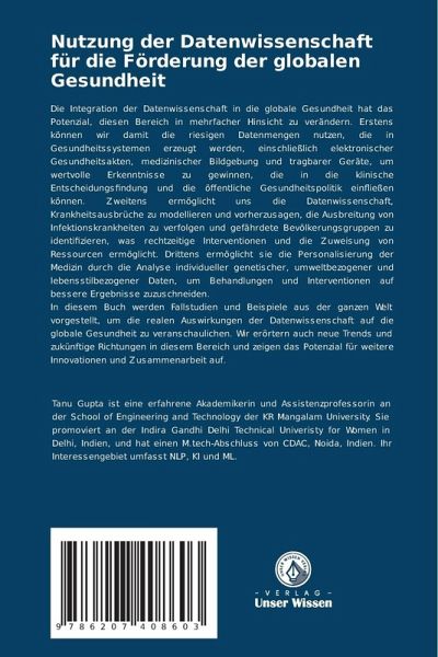 Die Integration der Datenwissenschaft in die globale Gesundheit hat das Potenzial, diesen Bereich in mehrfacher Hinsicht zu verändern. Erstens können wir damit die riesigen Datenmengen nutzen, die in Gesundheitssystemen erzeugt werden, einschließlich elektronischer Gesundheitsakten, medizinischer Bildgebung und tragbarer Geräte, um wertvolle Erkenntnisse zu gewinnen, die in die klinische Entscheidungsfindung und die öffentliche Gesundheitspolitik einfließen können. Zweitens ermöglicht uns die Datenwissenschaft, Krankheitsausbrüche zu modellieren und vorherzusagen, die Ausbreitung von Infektionskrankheiten zu verfolgen und gefährdete Bevölkerungsgruppen zu identifizieren, was rechtzeitige Interventionen und die Zuweisung von Ressourcen ermöglicht. Drittens ermöglicht sie die Personalisierung der Medizin durch die Analyse individueller genetischer, umweltbezogener und lebensstilbezogener Daten, um Behandlungen und Interventionen auf bessere Ergebnisse zuzuschneiden.In diesem Buch werden Fallstudien und Beispiele aus der ganzen Welt vorgestellt, um die realen Auswirkungen der Datenwissenschaft auf die globale Gesundheit zu veranschaulichen. Wir erörtern auch neue Trends und zukünftige Richtungen in diesem Bereich und zeigen das Potenzial für weitere Innovationen und Zusammenarbeit auf.